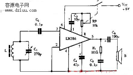 L、C1組成調諧回路,用于選擇要收聽的電臺信號;C2為耦合電容,將電臺高頻信號送至LM386的同相輸入端,由LM386進行檢波和功率放大,放大后信號由第5腳輸出推動揚聲器發聲。RP是放大器增益調節電位器,可以調節音量大小。當RP阻值調節為最小時,音量最大。