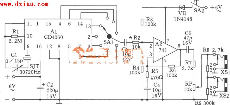 。集成電路CD4060是帶有振蕩器的十四級分頻器。晶體SJT產生30720Hz的微弱信號頻率,與Cl及CD4060內部反相器構成晶體振蕩。Rl用以提供反饋回路,僅在晶體的基頻上產生振蕩,振蕩中心頻率為30720Hz。微調電容Cl可使頻率精確調諧在中心頻率上。SA置于CD4060的13腳。30720Hz經CD4060九級(512次)分頻后,由13腳輸出高精度60Hz信號頻率,經電容C3耦合到運放器741的2腳進行信號放大,然后從741的6腳輸出。調節電位器RP時,XSl插口輸出0~1V,XS2插口輸出0~0.1V的低頻信號。其中,C2、C5為電源濾波電容。C3、C6為741的輸入、輸出耦合電容。R5、C4為高頻補償電路。R2、R4構成分壓衰減電路。R6為反饋電阻用以提高電路的穩定度。CD4060各腳的輸出頻率:3腳為2Hz,2腳為4Hz,13腳為60Hz,14腳為l20Hz,6腳為240Hz,4腳為480Hz,5腳為960Hz,7腳為l920Hz。本文由www.6600560.cn整理提供,部分內容來源于網絡,如有侵犯到你的權利請與我們聯系更正。
