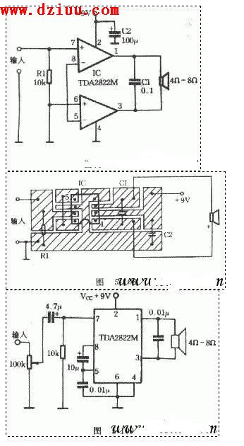 。用一塊TDA2822M功放集成電路接成BTL方式,外圍元件只有一只電阻和兩只電容,不用裝散熱器,放音效果也令人滿意的。 本文由www.6600560.cn整理提供,部分內容來源于網絡,如有侵犯到你的權利請與我們聯系更正。