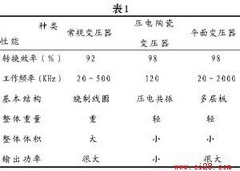 表1比較了常規變壓器、壓電陶瓷變壓器和平面變壓器的特性。下面就平面變壓器的物理特性和電氣特性分別說明。
