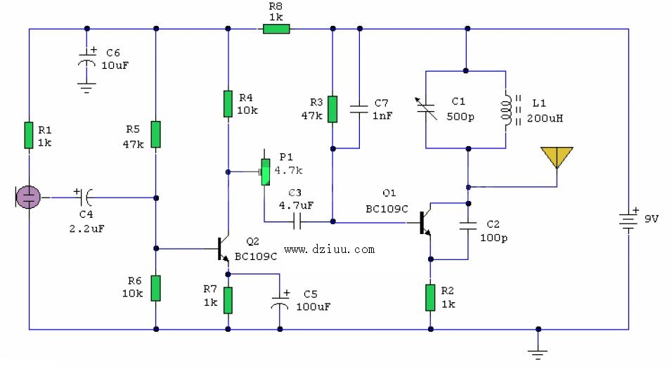 本電路采用9V供電,在市場就可以買到9V電池,很方便。電路元器件少,制作方便,調制簡單。元器件方便購買。發射的頻率根據調制功率大小可以在100~500M出實現接收(也