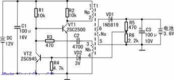 前的最大值下降,在反饋線圈Nb產生3負4正的感應電壓,使VT1基極電流減小,其集電極電流隨之減小,正反饋再一次出現雪崩過程,VT1迅速截止。VT1截止后,變壓器T1儲存的能量提供給負載,次級線圈Ns產生的5負6正的電壓經二極管VD1整流濾波后,在C3上得到直流電壓給手機電池充電。在VT1截止時,直流供電輸人電壓和Nb感應的3負4正的電壓又經R1、R3給C2反向充電,