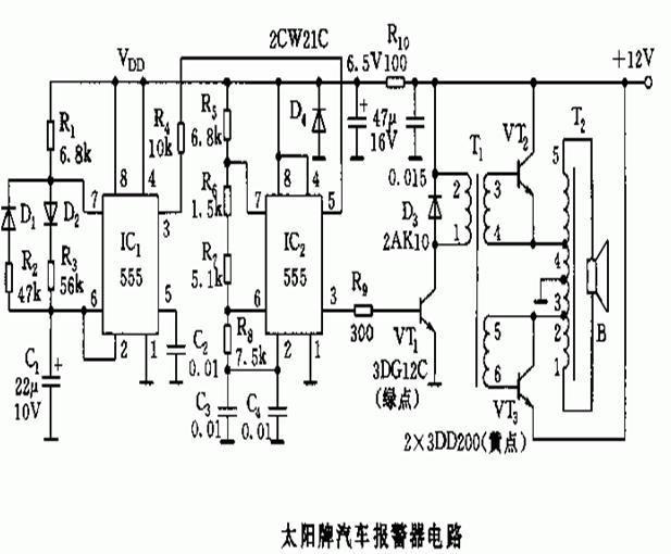 由汽車電瓶供電,兩塊555集成電路構成的變音振蕩器和音頻功放組成。IC1、R1、R2、R3、C1、D1、D2等組成無穩態多諧振蕩器電路,頻率由電路的充電時間T充和放電時間T放決定。