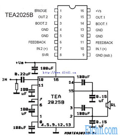 都要在集成塊上面加散熱器。本人在喊話器中看到過應用。輸入電壓是9V的,效果好。下面提供TEA2025B的電路圖,供大家維修、制作使用。