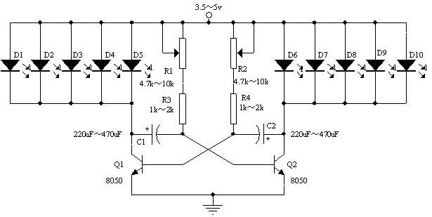 電路中都可以看到,本LED廣告彩燈電路采用兩只NPN三極管8050驅動多只LED組成,其工作原理是:
