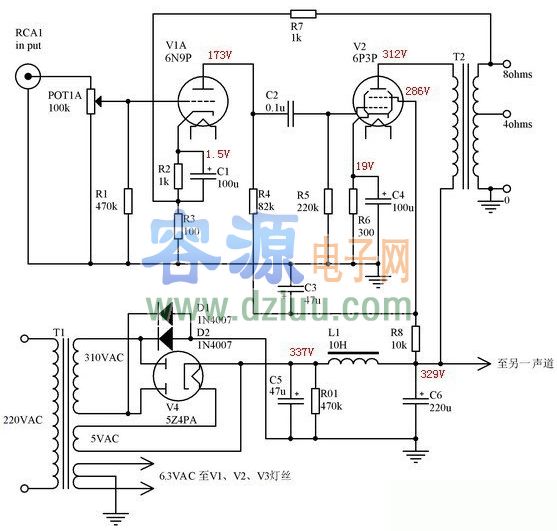 6P3P電子管放大器電路圖 <<版權聲明:本文由容源電子網(www_dziuu_com)整理提供,部分內容來源于網絡,如有侵犯到你的權利請與我們聯系更正。》