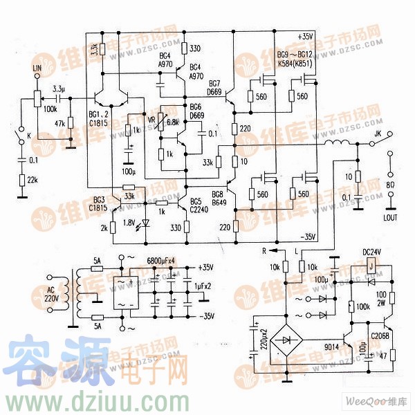 場效應管偶次諧波豐富, 聽感頗有電子管的風味。 而且其輸出功率相比電子管可以做得很大,且成本不高,所以膽前級配場效應管功放,在圈內很流行。相同極性場效應管功放電路 本電路輸入部分較為簡潔,采用一對
