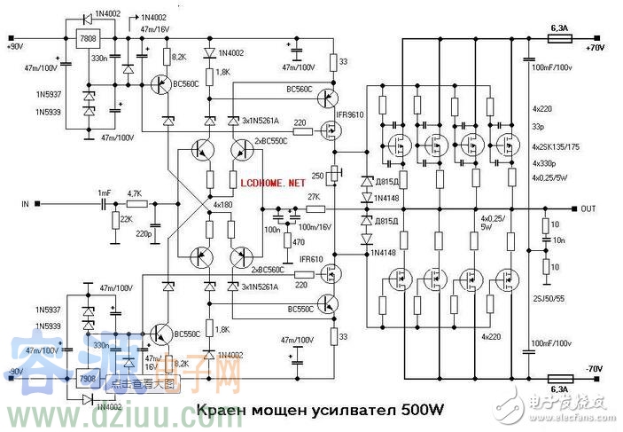 幾款不錯的電路圖 場效應管多管并聯輸出,500W。 場管跟普功率最大不同就是場管是用電壓驅動,在驅動級上有些不一樣,沒弄過場管功放,音質怎要看你設計和工藝! IRFB33N15D是一顆非常好的MOS管