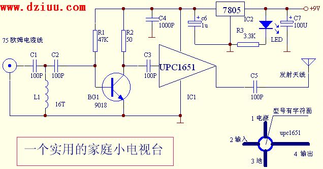 電路的工作原理是射頻信號經(jīng)75歐姆射頻電纜送至有C1、 L1、C2 構成的高通濾波器,將低于45MHZ的頻率濾除,然后在經(jīng)三極管9018等組成的前置放大器放大后由電容C3送至upc1651進行功率放大,其輸出信號經(jīng)60cm左右的鞭狀天線發(fā)射 出去。7805等構成穩(wěn)壓與電源指示為upc1615提供5V的供電。
