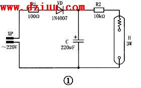 。H是小功率冷陰極低壓熒光燈。當電路接入電網后,220V交流市電經電阻器R1限流、晶體二極管VD半波整流后,將電容器C兩端電壓充至290V左右,