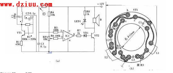 的環(huán)形印制板上。線圈L1用如。1mm漆包線在內(nèi)徑為10mm的圓柱形變壓器骨架上密繞30匝,其外用同樣漆包線繞1匝
