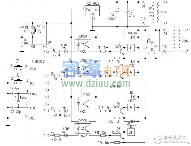 減輕合閘時的負載,用8只空氣開關分別控制8個電熱水器。使用時,只要開8次空氣開關,不用時又要關8次空氣開關。空氣開關少了,水溫升的慢,關少了,浪費電。為此,今天本文用89C2051制作了一個8路電熱水器順序延時開關控制器,