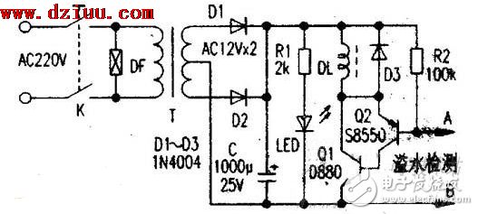 Q1、Q2均截止。當有水溢出時,A點經水接B點,Q1、Q2導通‘,K中的線圈DL通電,K解鎖復位,整個電路自動斷電,上水結束。這就避免了人工守候的麻煩。進水電磁閥與原上水閥并接,以便停電時手動上水。