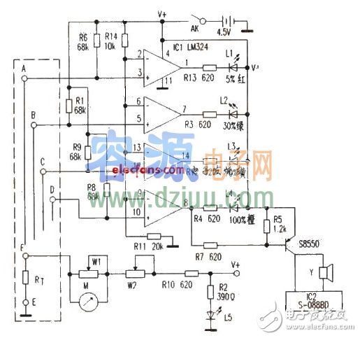 當AK接通后,表M有電流流過,指示水溫。RT為負溫度系數熱敏電阻,水溫升高,其阻值變小,流過M指示大。L5為表頭指示背景燈,接通電源即亮,w1、w2為表頭調校電位器。