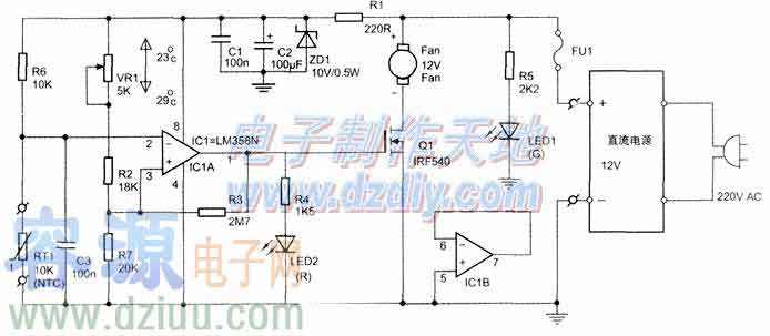 測溫電橋由溫度傳感器RT1與R6、VR1、R2、R7組成。IC1是一塊雙運放lm358N,在這里只用了其中一運放,接成帶滯后的電壓比較器。其同相輸入端加有VR1調定的基準電壓,調節VR1就可以在控溫范圍內設定不同的溫度;反相輸入端則加有R6與RT1的分壓,由于RT1的阻值是隨被測環境溫度變化而改變的,因此ICIA反相端電位也隨溫度變化而改變。MOSFET管Q1在ICIA輸出電平(L≈0V,H≈10.5V)的控制下對負載散熱風扇Fan起電源開關作用。當水族箱水溫高于VR1的調定溫度值時,RT1阻值較小,R6和RT1分壓后使ICIA反相輸入端2腳的電位較低,此時ICIA的同相輸入端3腳電位大于反相輸入端電位,ICIA因而輸出高電平,使MOSFET管Q1飽和導通,負載散熱風扇Fan得電工作,對水族箱水降溫,同時LED2點亮,顯示負載Fan處于工作狀態。隨著水溫的下降,RT1的阻值逐漸增大,ICIA反相輸入端2腳的電位也隨之逐漸升高,當高于同相端基準電位時,ICIA即翻轉輸出低電平,Q1截止,負載Fan停止工作,同時LED2熄滅。以后,當水溫又將逐漸回升,當升至高于設定溫度時,又重復上述過程,如此周而復始使水族箱水溫保持在恒定值。