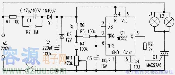 工作原理 電路原理如附圖所示,R1、R2、D1、D2,Cl、C2構成12V電源,為整機提供電源電壓,NE555及外圍元件組成帶延時的施密特觸發器,電路中RG為光敏電阻,用于檢測周圍環境的亮度。黃昏時,周圍環境的亮度逐漸變暗,RG的阻值也隨之變大,IC1的②、⑥腳電位逐漸降低,當電位小于1/3Vcc時,IC1的③腳輸出高電平,雙向可控硅Q1被觸發導通,燈籠中的燈得電被點亮。到了早晨,天空漸漸變亮,RG的阻值逐漸變小,IC1②、⑥腳的電位逐漸升高,當電位高于2/3Vcc時,③腳輸出低電平,Q1截止,燈籠中的燈熄滅。因NE555及外圍元件構成的施密特觸發器的回差電壓達1/3Vcc,所以在臨界亮度附近時,可以消除燈的閃爍發光現象。同時,為了避免節日的夜晚施放煙花、焰火時使周圍亮度發生急劇變化而使燈出現亮/滅閃爍現象,電路中特地加了延時電容C3。