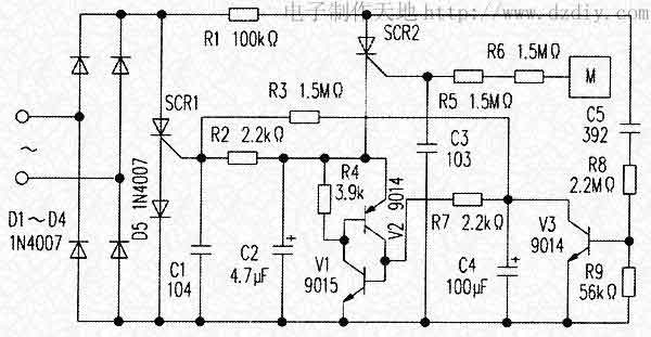 附圖所示電路可用于洗衣機或需要吸氣/排氣的風扇電機定時自動換向運轉電路。圖中虛線框內是電機M的電原理圖,C為裂相電容器,用作產生旋轉磁場使M轉動。L1、L2是參數完全相