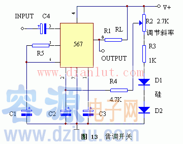 LM567為通用音調譯碼器,當輸入信號于通帶內時提供飽和晶體管對地開關,電路由兩個檢波器構成,由電壓控制振蕩器確定譯碼器中心頻率。用外接元件獨立設定中心頻率帶寬和輸出延遲。主要用于振蕩、調制、調解和遙