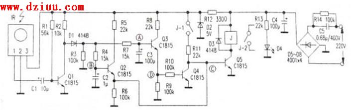 ,最終使A點電位大于1V(實測為1.3V左右),Q3導通,D點為高電平,Q4導通,C點為低電平,致使Q5截止,J釋放,J-1、J-2斷開,達到長按遙控鈕實現關機的目的。松開遙控鈕后,IR不再收到紅外線信號,C2、C3放電,Q2、Q3截止,電路又進入等待