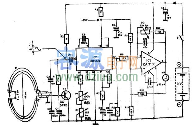 振蕩器T1、頻率-電壓轉換器IC1和MOS雙運放器IC2。探測頭線圈直徑為440mm,C1和C2的值可保證振蕩器的頻率約為300KHz,若采用較小直徑探測圈,則線圈需繞較多匝數。 <<版權聲明:本站內容部分來源于網絡,如侵犯到你的權利請及時與我們聯系更正,聯系QQ:316520686。》