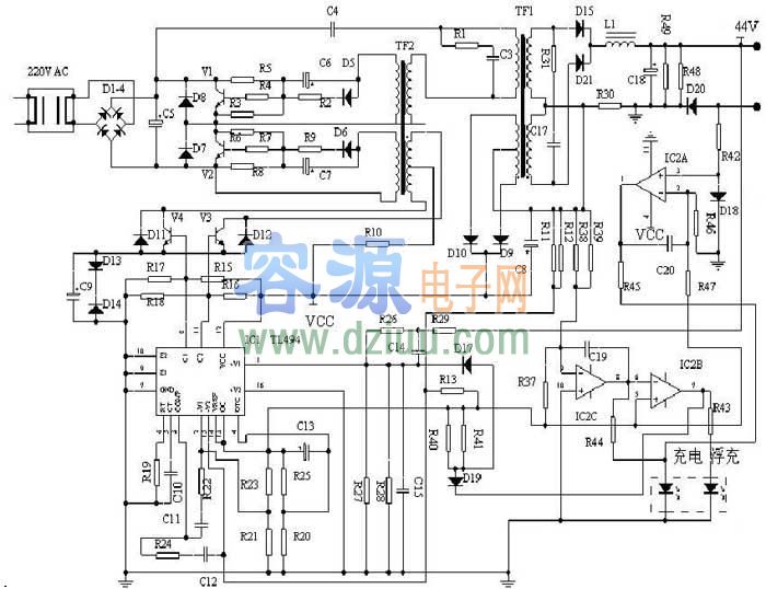基于UC3842電動車充電器電路圖 ;;該電動車充電電路采用UC3842集成電路制作的開關電源電路,具有效率高,市電電壓范圍寬等優點。電路簡單,維修方便,是最常用的電動車充電器電路,電路圖如下: