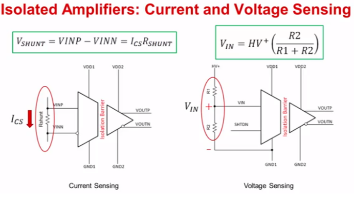 這是隔離放大器的一些常見應用示例,電流傳感和電壓傳感。TI提供了各種可實現分流式電流傳感的隔離放大器,其輸入范圍為正負50毫伏或正負250毫伏。隔離放大器的輸入電壓范圍根據所要測量的電流來確定分流電阻器的值。對于使用分壓的電壓傳感應用,TI可提供輸入范圍高達正負12伏的隔離放大器。