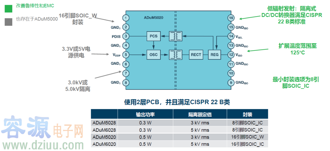 ADI新一代isoPower系列產(chǎn)品 新一代isoPower系列產(chǎn)品采用創(chuàng)新的設(shè)計(jì)技術(shù),可以避免產(chǎn)生大量輻射發(fā)射,甚至在沒有旁路電容的2層板上也不例外。ADuM5020和ADuM5028在以大幅裕量滿足CISPR22/EN55022B類限制的同時(shí),可以分別跨隔離柵提供500mW和330mW功率。