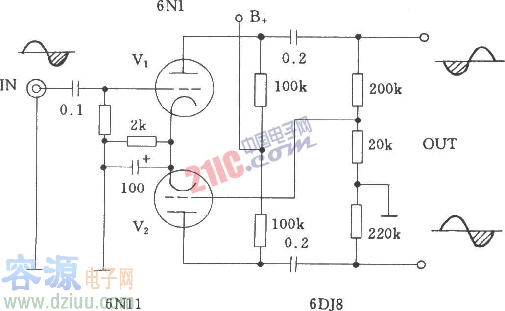 分壓式電子管倒相電路主要由6N1及簡單元件構成。 電子管,是一種在氣密性封閉容器(一般為玻璃管)中產生電流傳導,利用電場對真空中的電子流的作用以獲得信號放大或振蕩的電子器件。早期應用于電視機、收音機擴
