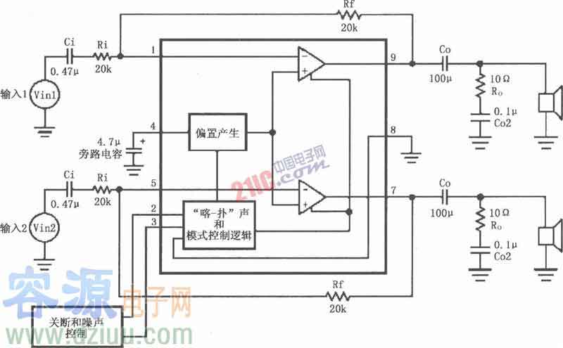 LM4916用于雙聲道放大器電路左、右聲道音頻信號分別輸入LM4916的1、5腳,經過內部放大器放大后分別由9、7腳輸出,經過耦合電容Co加到各自聲道的揚聲器上。LM4916的2腳外接關斷控制,當2腳接VDD時允許工作;接低
