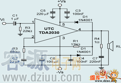 TDA2030典型應(yīng)用電路圖1: