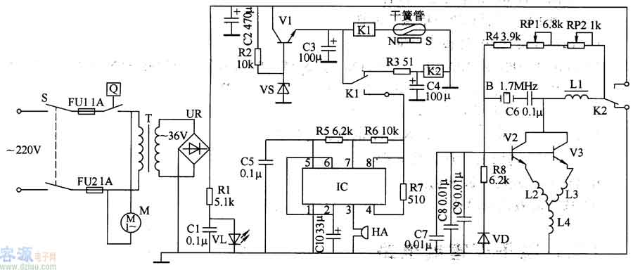 接通電源開關S,交流220V電壓經T降壓 (36V)、UR整流及C2濾波后分為3路:一路供給超聲波振蕩器;一路經Vl和VS穩壓調整為l2V,作為Kl、K2和IC的工作電源;另一路經Rl限流降壓后將VL點亮。