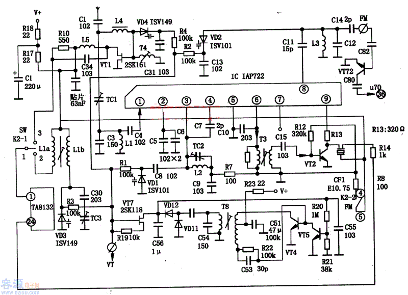 lAP722的⑨腳為電壓控制端,受波段開關(guān)控制。當(dāng)波段開關(guān)打在FM位置時,K2-2與④、⑤腳接通,lAP722得電工作。