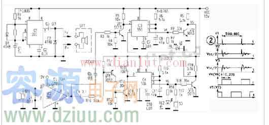 圖中集成時基電路IC1、被測揚聲器SP1等元件組成尖脈沖聲激勵發射電路,由SP1發射間隔T約為0.69秒的尖脈沖聲信號,由于阻尼二極管D2的作用,使SP1的自由振蕩余振波小得可以忽略不計,波形如圖