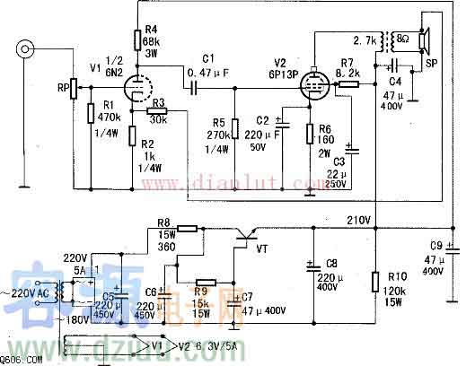 由6P13P設(shè)計(jì)的膽機(jī)功放電路圖如圖。 其具體工作原理為:其采用5A全橋整流。該直流210V電壓經(jīng)R7降壓、C3、C9濾波,供給6P13P屏柵極工作。經(jīng)變壓、整流和C5、R8、C6濾波后,再經(jīng)VT、R9、C7和C8進(jìn)一步濾波,供給