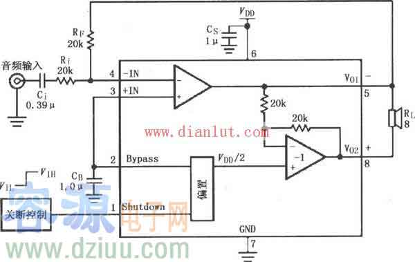 工作原理:音頻信號輸人后,經過Ci、Ri耦合加到放大器的反相輸入端(4腳),而放大器的同相輸入端(3腳)則交流接地,放大后的信號從5、8腳輸出。5、8腳之間接負載,如揚聲器,由此構成反相功率放大電路。為了避