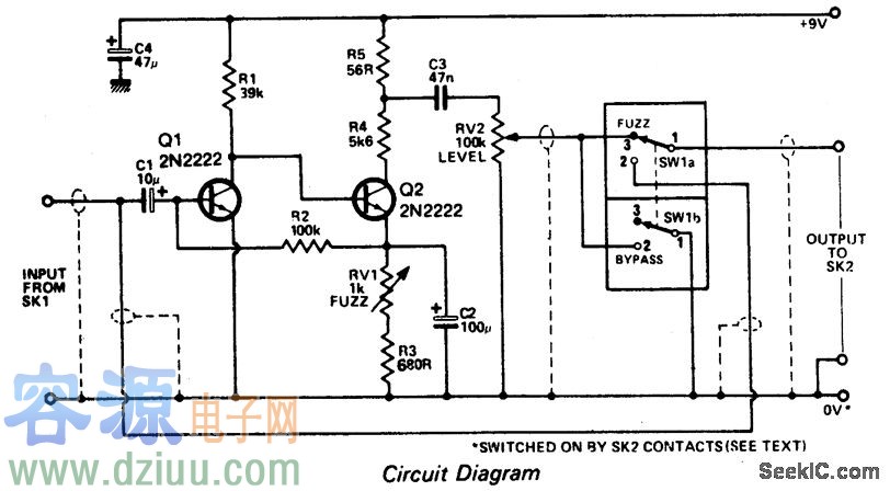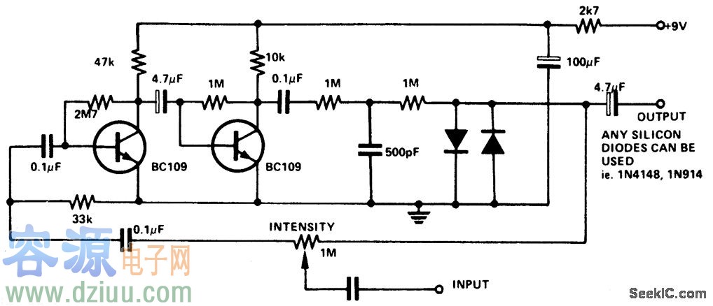 電路說(shuō)明:輸入信號(hào)經(jīng)過(guò)晶體管時(shí)會(huì)放大。失真輸出然后被兩個(gè)二極管夾合,高頻噪音被電路通過(guò)500pF的電容器過(guò)濾。正常情況下,1M的滑動(dòng)變阻器可調(diào)整噪音,使其強(qiáng)度從最大降到?jīng)]有。 :
