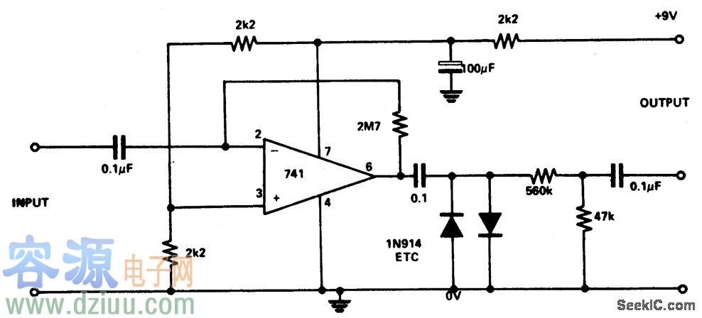 電路說(shuō)明:741電路的最大增益為20000,但是該電路的設(shè)計(jì)卻使增益為2700000,然后引起輸出的失真。這場(chǎng)失真引起噪音效應(yīng)。兩個(gè)二極管夾住輸出以降低電平,同時(shí)這兩個(gè)二極管受分倍器的影響變低。由于夾合會(huì)產(chǎn)生一種