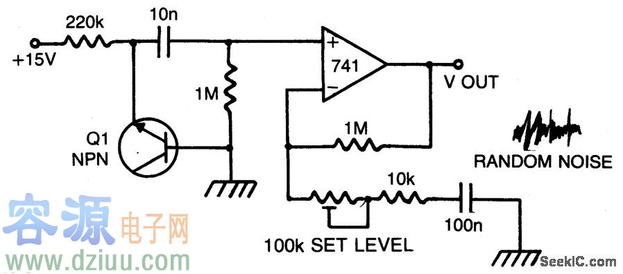 晶體管連接的齊納管擊穿用于噪音產(chǎn)生。擊穿機(jī)制是隨機(jī)的,電壓有高源阻抗。通過(guò)應(yīng)用運(yùn)放器作為高阻抗,獲得高交流增益放大器,低阻抗大信號(hào)噪音源。這個(gè)100K電位器用于通過(guò)變換增益(從40到20)來(lái)設(shè)置噪音。 :