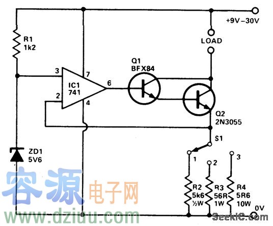 該電路可提供3路預(yù)設(shè)電流,這些電流一直是固定的,盡管環(huán)境溫度和線電壓會(huì)發(fā)生變化。ZD1產(chǎn)生用于IC1的同相輸入的溫度穩(wěn)定的參考電壓。來(lái)自輸出的100%的反饋可用于反相輸入中,用來(lái)保持Q2的發(fā)射極的電壓和同相輸入