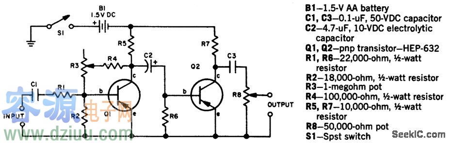 電路說(shuō)明:晶體管Q1和Q2可放大輸入信號(hào),當(dāng)用在一個(gè)電吉他時(shí),由于增益太大,所以輸入超載。RV1調(diào)整現(xiàn)存的反饋數(shù)量,增強(qiáng)電壓增益,于是輸出相當(dāng)于一個(gè)四方的輸入信號(hào)。四方的數(shù)量會(huì)隨著RV1的變化而變化。 :