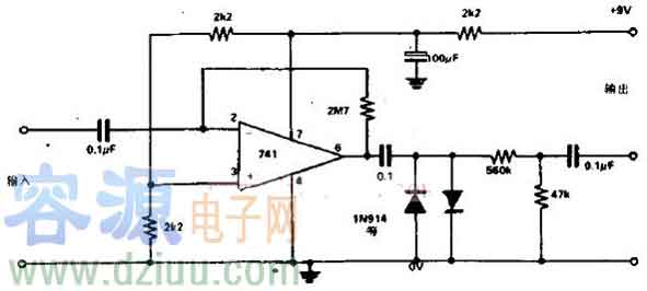該電路是一個以LM741型運算放大器為基礎構成的倒相放大器,用于驅動晶體管互補對Q1和Q2.運算放大器的反饋回路包括兩個晶體管的基極-發射極結。這種電路配置有助于減小失真。通宵發射極-基極結的電壓降低大約0.6