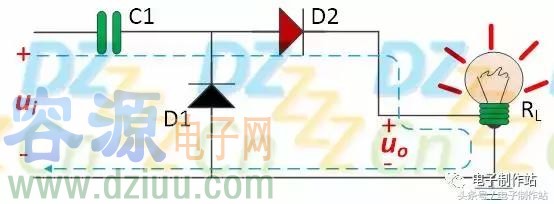 當電壓ui的第一個正半周來到時,電壓ui極性為上正下負,電壓ui經過電容C1給二極管施加反向偏置使其截止,同時給二極管D2正向