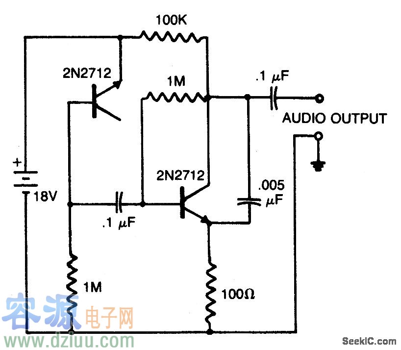 2N2712晶體管的反轉(zhuǎn)偏置NPN結(jié)用于噪音發(fā)生器。第二個2N2712是一個音頻放大器。流經(jīng)放大器輸出的0.005μF電容器消除了一些高頻成分以便更接近模仿粉紅噪音。為了揚聲器聆聽,音頻輸出可能連接到高阻抗的耳機或者驅(qū)