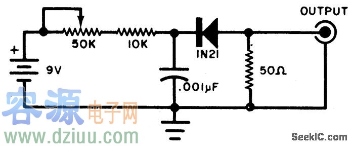 該電路產(chǎn)生寬帶RF噪音。它利用反轉(zhuǎn)偏置二極管并且具有低阻抗輸出。它能用來調(diào)整接收器到最佳狀態(tài)。 :