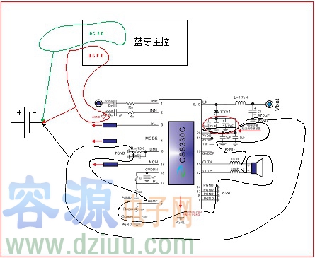 電路板上所有的器件以及單元電路都是以地線作為參考電位。原理上地線作為零電位,器件之間不會產(chǎn)生由于地線的耦合干擾。但實際是不可能的,所有引線都具有阻抗,只要地線有電流流過,就會產(chǎn)生相應(yīng)的壓降。電路走線還會形成電感,這意味著電流從電源正極流向負(fù)載,然后返回電源負(fù)極,在整個電流通道上存在一定的電感。工作在較高頻率時,電感將增大地線阻抗,比如DC-DC升壓電路中電源-電感-MOS管-地通路。如果不分地,特別整個地平面不完整,音頻功放信號又是單端輸入的情況下,數(shù)字電路以及升壓電路的開關(guān)噪聲就會通過地線耦合到音頻功放的輸入端或者電源端,最終喇叭輸出明顯的底噪聲。所以分地是一個處理底噪聲的好辦法。以內(nèi)置升壓音頻功放CS8330用于藍(lán)牙音箱為例,可將整個PCB板地線分成三部分:DGND, PGND, AGND。DGND是主控數(shù)字電路部分,包括藍(lán)牙射頻部分地線可跟數(shù)字地接一起。PGND主要是音頻功放DC-DC升壓部分以及功率放大部分,包括外圍的濾波電容。充電部分可在功放的前端接一起,也可單獨一部分。AGND包括藍(lán)牙主控芯片ADC, DAC,MIC部分模擬地以及音頻功放內(nèi)部輸入端預(yù)放部分模擬地。最終DGND,PGND,AGND三大塊在電池或者電源輸入端匯總一點接地。如下圖所示: