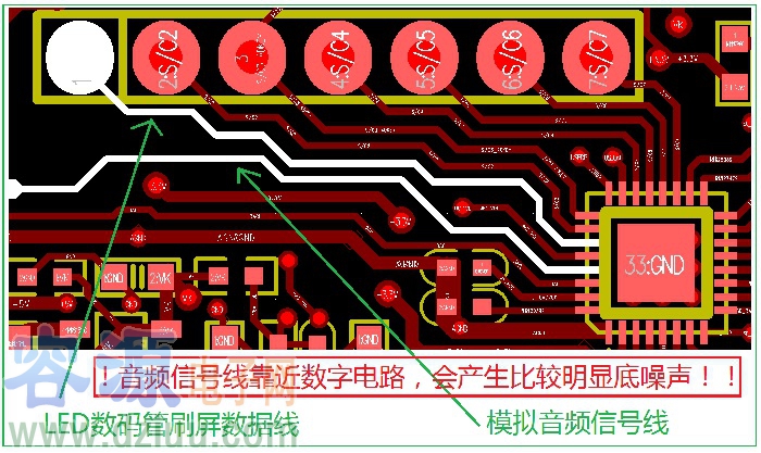 (2). 音頻信號走線盡量遠(yuǎn)離數(shù)字電路。