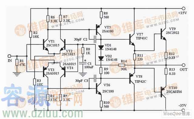 10W低失真運(yùn)放推動(dòng)晶體管功放制作電路圖