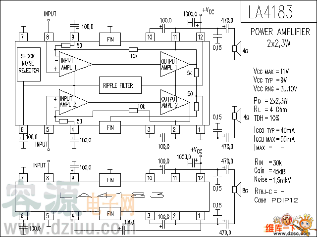 lm380集成功放電路圖:有了這個(gè)簡(jiǎn)單的電路圖,你可以使用立體聲來(lái)驅(qū)動(dòng)一個(gè)8Ω的揚(yáng)聲器。