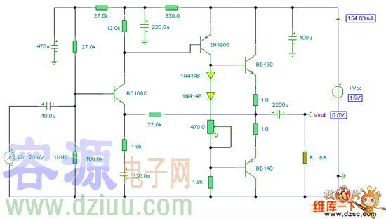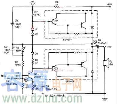 此電路簡單、價廉,可用一對TO-220單塊達林頓晶體管構成推挽輸出級,頻響在30Hz到200kHz內偏差小于1dB,諧波失真低于0.2%。在8Ω負載上20W滿輸出時放大器僅需輸入有效值1.2V的電壓。本電路僅需外加一個晶體管,