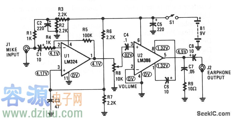 該放大器用于探測電視音頻輸出信號,并將它放大,驅動耳機聽到聲音。它圍繞LM324四運放和LM386低功率音頻放大器設置。該電路采用低價駐極電介體麥克風作為輸出設備。 :